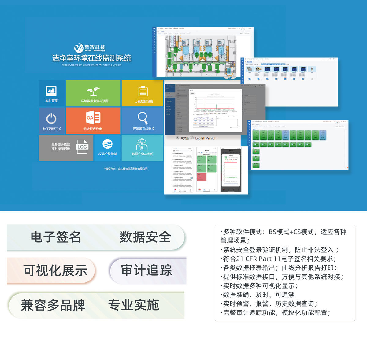 • 潔凈環境在線監測系統主要由測量傳感器、真空泵控制系統、網絡機柜,報警系統和上位機監控軟件五大部分組成,可實現對潔凈室中潔凈度、溫濕度、壓差、風速等參數的實時監測,并完成數據儲存、管理等功能。在生產過程中,周圍環境的情況通常是不斷變化的,而人工監測無法提供連續監測數據,因此無法估計系統是在何時偏離了規定工況,更無法估計產品的質量情況。而潔凈環境在線監測系統避免了人工監測的這種缺陷,它將多臺遠程遙控粒